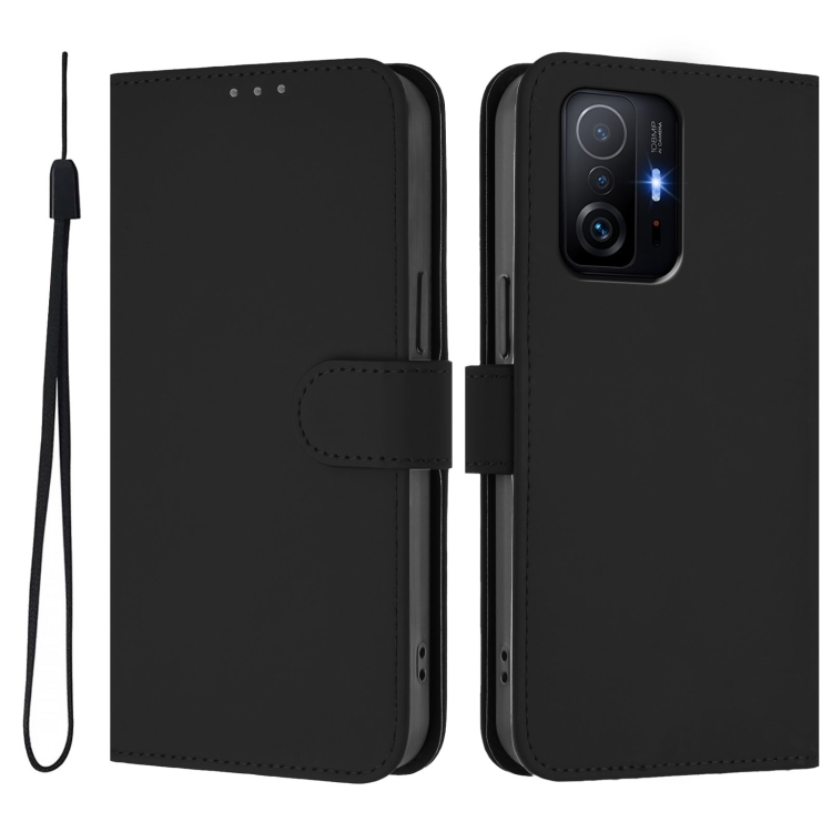 Funda de Piel Sintética con Cordón para Xiaomi 11T/11T Pro, Color Liso, con Tacto de Piel (Negro)