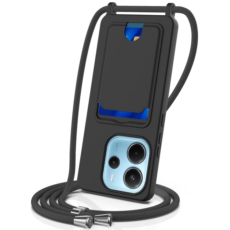 Funda de silicona líquida de color sólido con cordón para Redmi Note 14 4G (163,25 mm) con tarjetero integrado (negro)