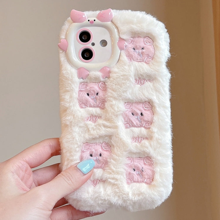 Funda de Teléfono iPhone 16 Bordado Felpa Cobertura Total (Blanco y Rosa)