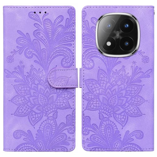 Funda de Teléfono con Hebilla Magnética de Pu con Encaje Floral En Relieve y Correa para la Muñeca para Redmi Note 14 Pro / Note 14+ (Morado)