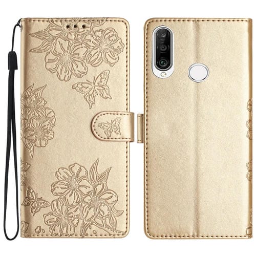 Funda de PU con Relieve Mariposa y Flor de Cerezo para Huawei Y6P (Dorada)