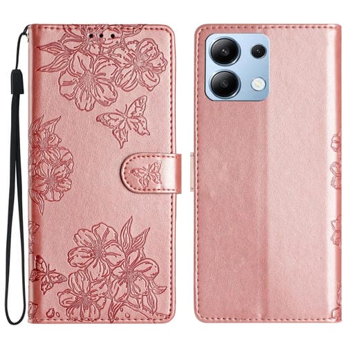 Funda de Teléfono de Pu con Relieve de Piel de Mariposa y Diseño de Flor de Cerezo para Redmi Note 13 4G (Oro Rosa)