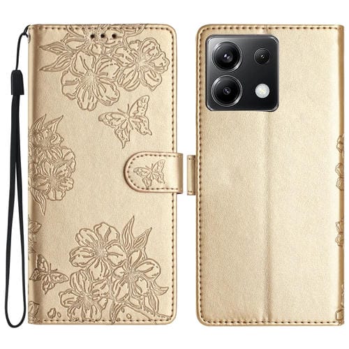 Funda de Teléfono de Pu con Relieve de Piel de Mariposa y Diseño de Flor de Cerezo para Xiaomi Poco X6 (Dorada)