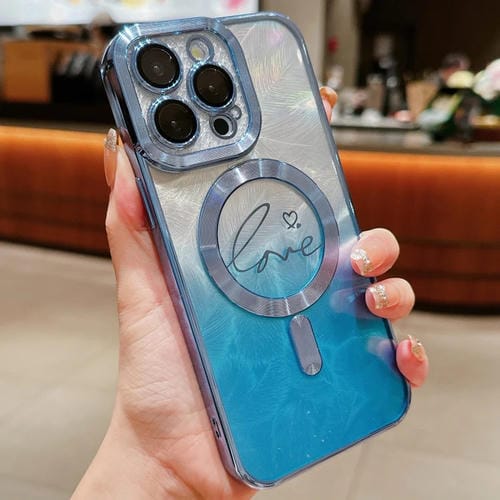 Funda de Teléfono TPU Purpurina Degradado Plumas Amor para iPhone 14 Pro Max (Azul)