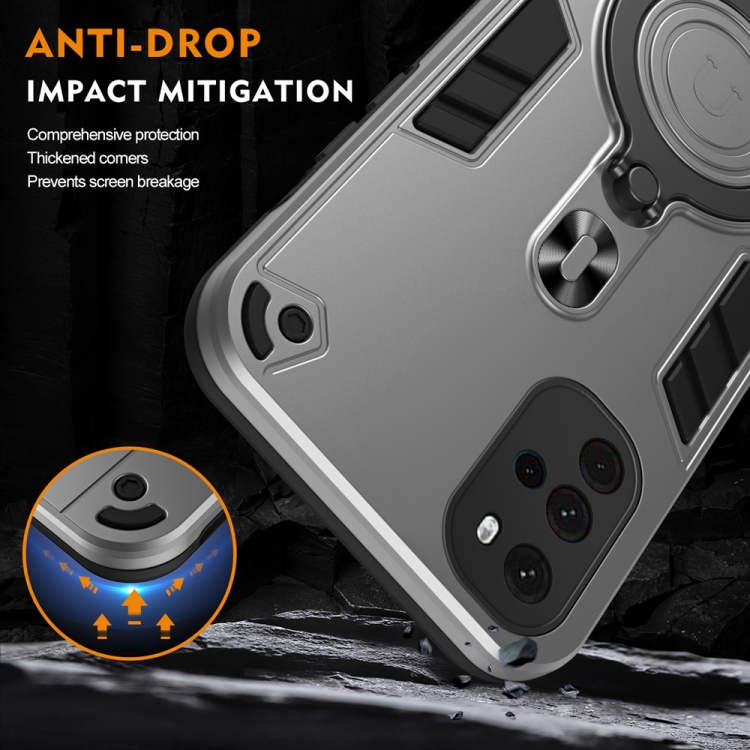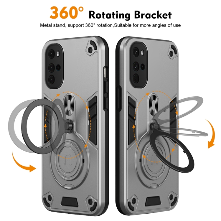 Funda Híbrida TPU y PC con Soporte Giratorio 360° y Anillo Metal para Motorola Moto G22 (Gris Plateado)