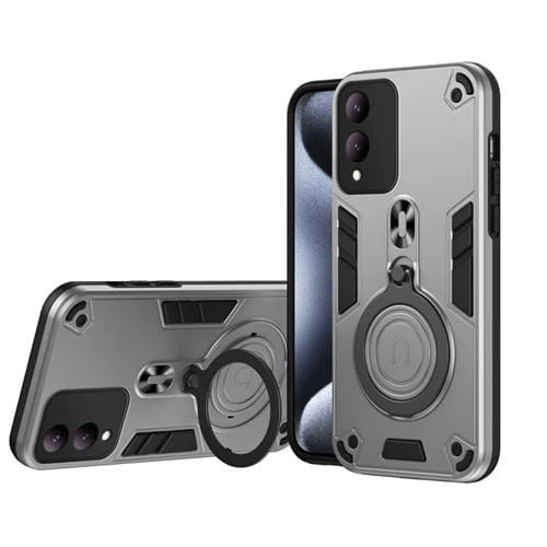 Funda de Teléfono Híbrida de TPU y PC con Soporte Giratorio de 360 Grados y Anillo de Metal para Vivo Y17S (Gris Plateado)