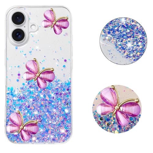 Funda TPU iPhone 16 Plus Diseño Mariposa Purpurina Cielo Estrellado Luminoso (Morado)