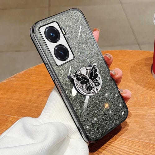 Funda de TPU con Soporte para Mariposa con Purpurina Degradada Chapada para Vivo Y77 5G (Negra)