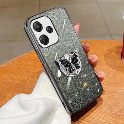 Funda de TPU con Soporte para Mariposa con Purpurina Degradada Plateada para Redmi 12 5G (Negro)