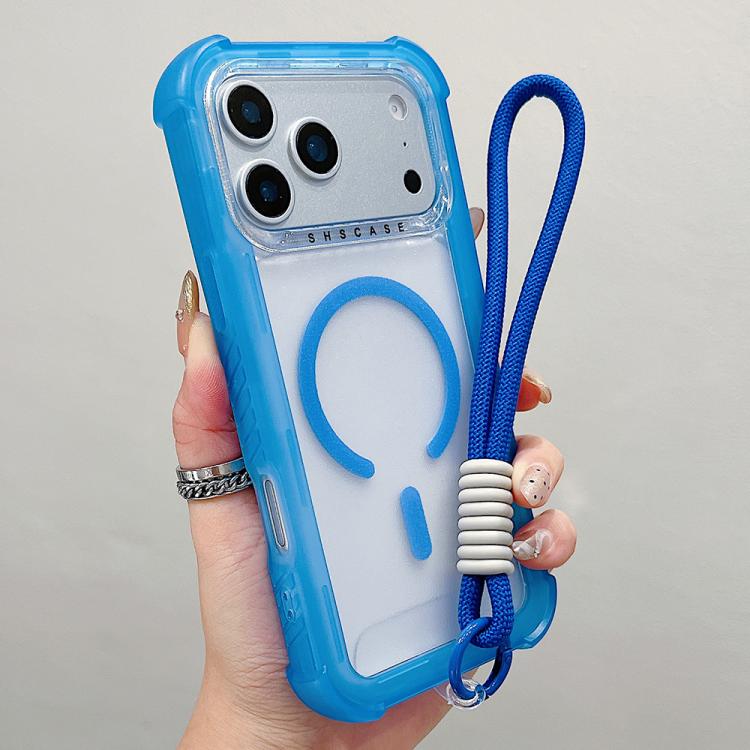 Funda híbrida de TPU mate transparente 3 en 1 MagSafe para iPhone 17 Pro con correa de muñeca (azul)