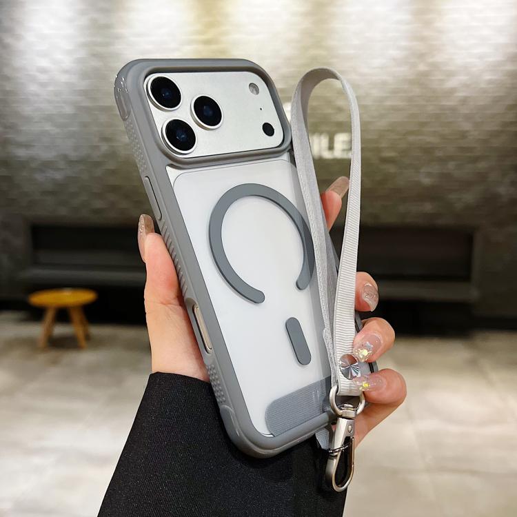 Funda magnética MagSafe transparente con borde liso y correa para la muñeca para iPhone 17 Pro Max (gris)
