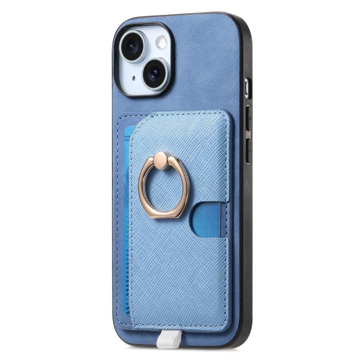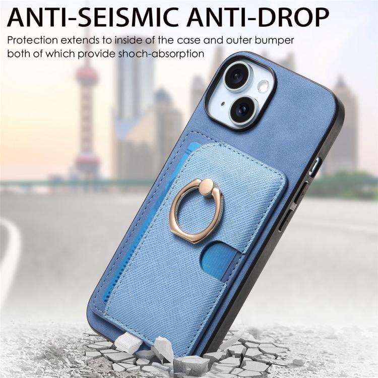 Funda para iPhone 15 con Ranuras para Tarjetas y Anillo de Cuero (Azul)