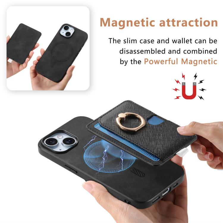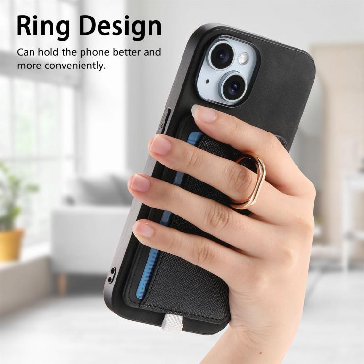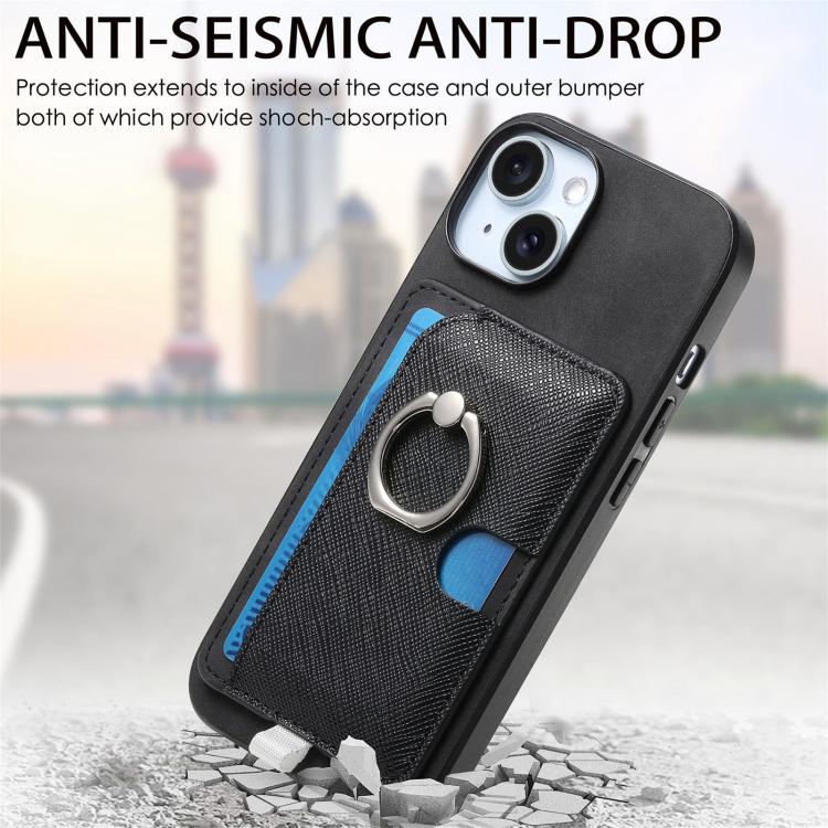 Funda para iPhone 15 Cuero con Ranuras para Tarjetas y Anillo Diseño Retro (Negro)
