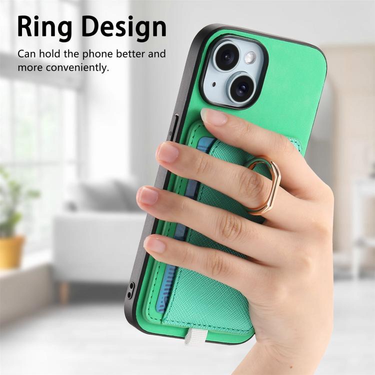 Funda para iPhone 15 Cuero con Ranuras para Tarjetas y Anillo Diseño Retro (Verde)