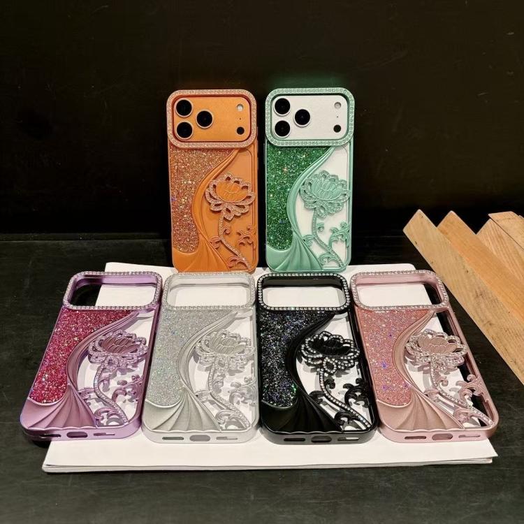 Funda para iPhone 17 Pro Max de TPU electrochapado con diseño de loto calado y purpurina de diamantes de imitación (verde)