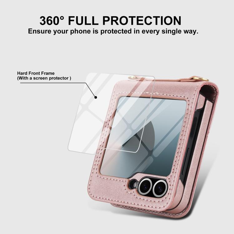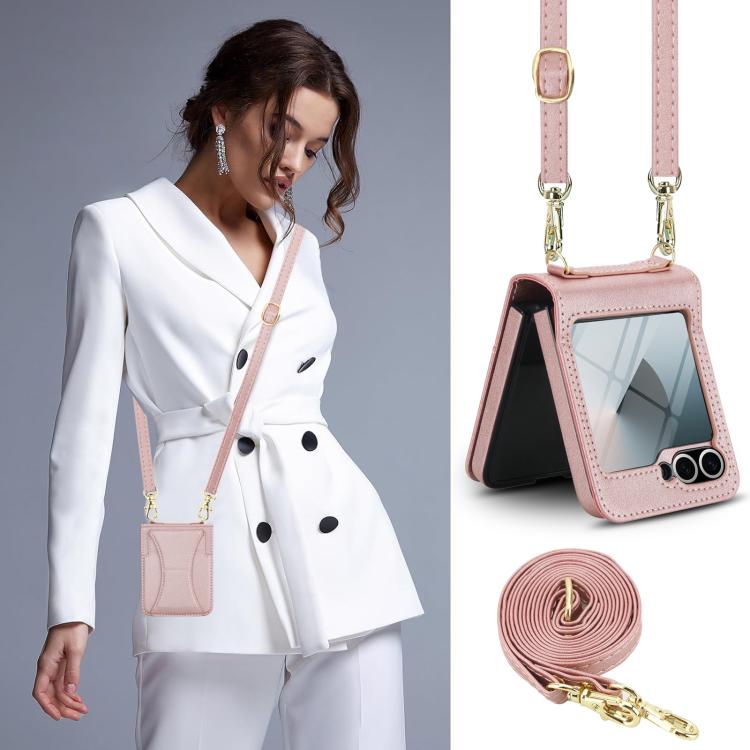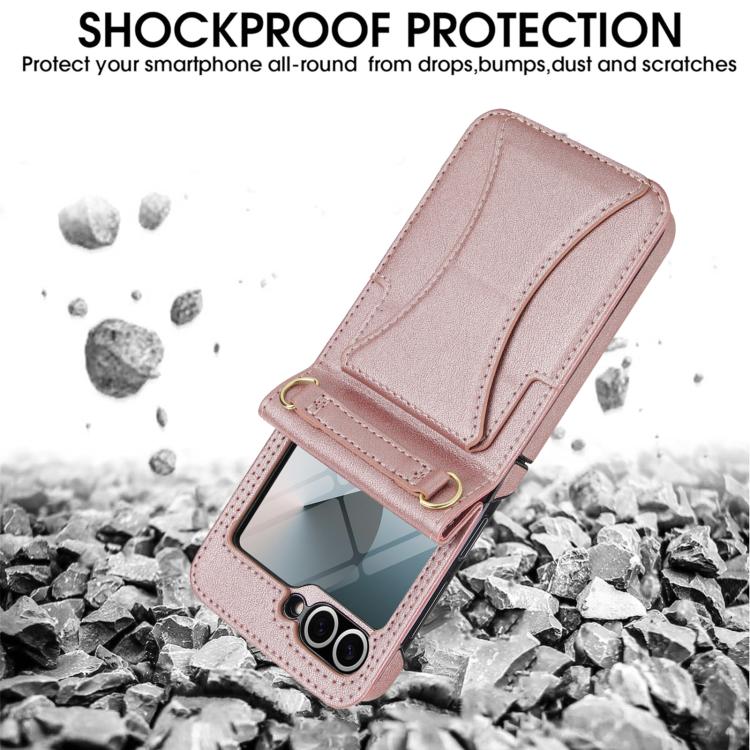Funda para Samsung Galaxy Z Flip6 con ranura para tarjetas y soporte plegable integrado, con cordón largo y corto (oro rosa)