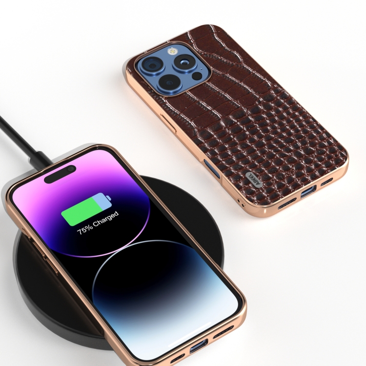 Funda para Teléfono Abeel iPhone 16 Pro Max Diseño Cocodrilo Cuero Genuino Marco Galvanizado (Café)