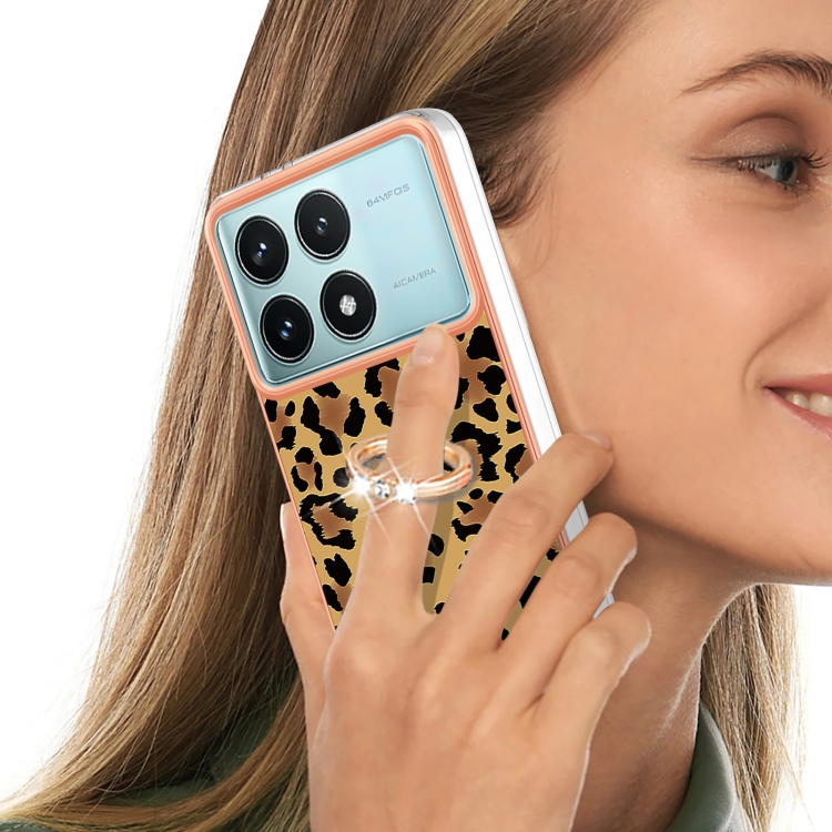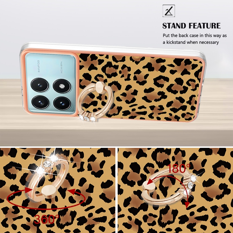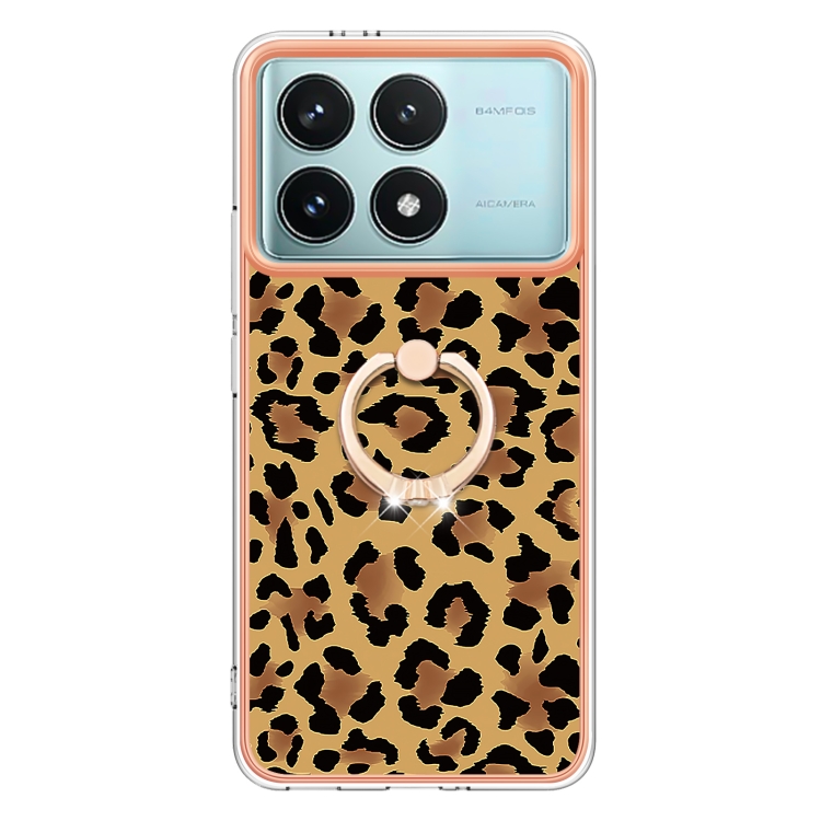 Funda para Teléfono con Galvanoplastia Imd de Doble Cara con Soporte para Anillo para Xiaomi Poco F6 Pro 5G (Estampado de Leopardo)
