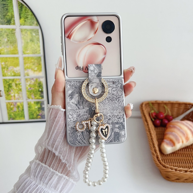 - 1x Funda para Teléfono Honor Magic V con Tapa Bordado Estilo Flip Cobertura Total Cadena y Anillo (Gris)