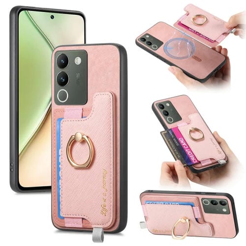 Funda para Teléfono con TaRJetero y Anillo de Cuero con Diseño Retro Magsafe Cross para Vivo Y200/V29E (Rosa)