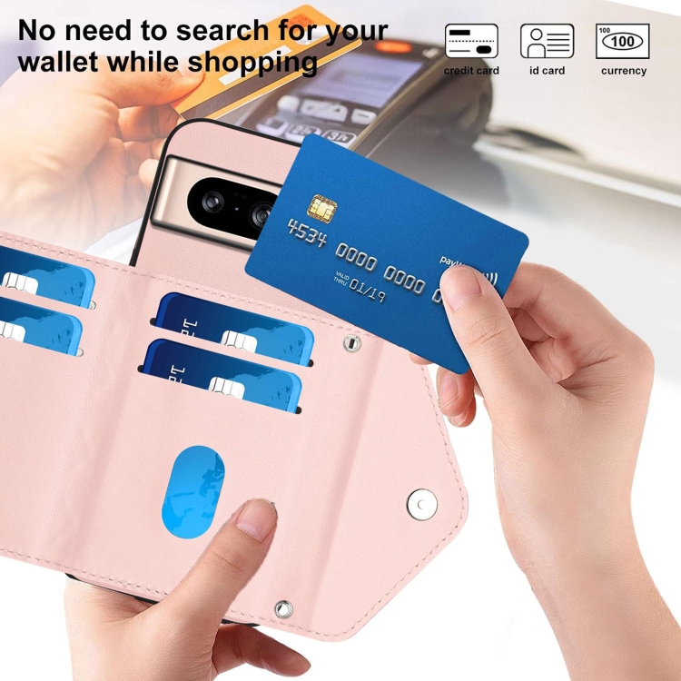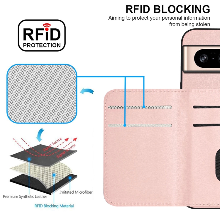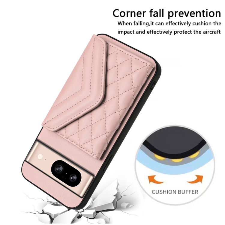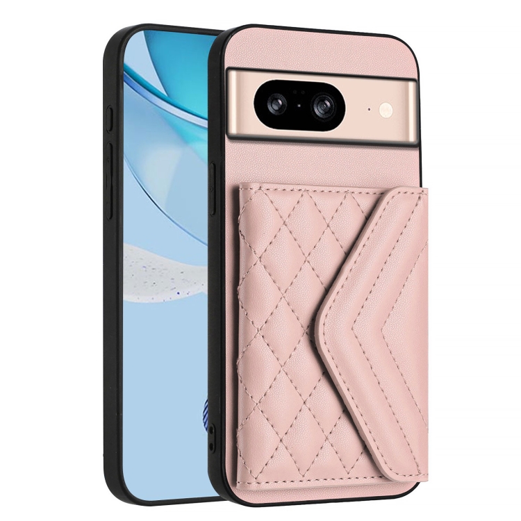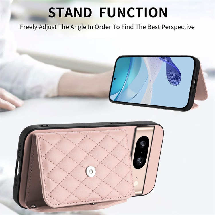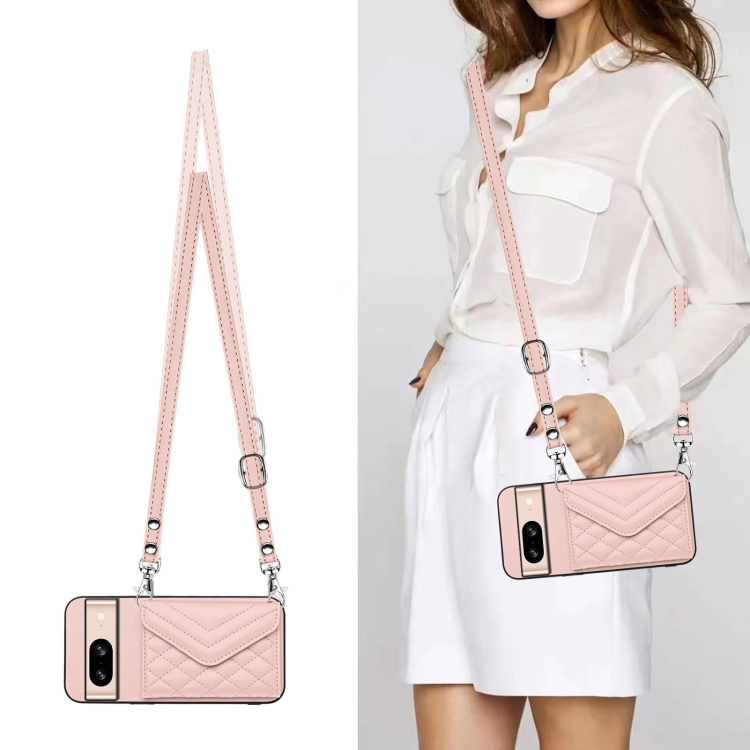 Funda para Teléfono Google Pixel 8 con Textura Rombal y Tarjetero RFID con Cordón Largo (Oro Rosa)
