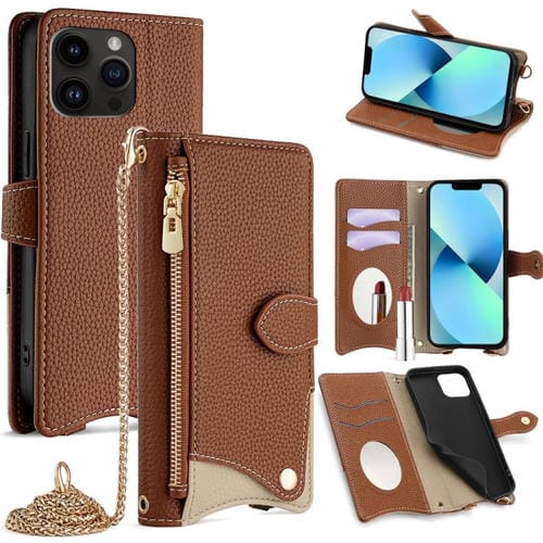 Funda de Piel de Lichi con Diseño de Cola de Pez y Cadena Cruzada para iPhone 13 Pro Max (Marrón)
