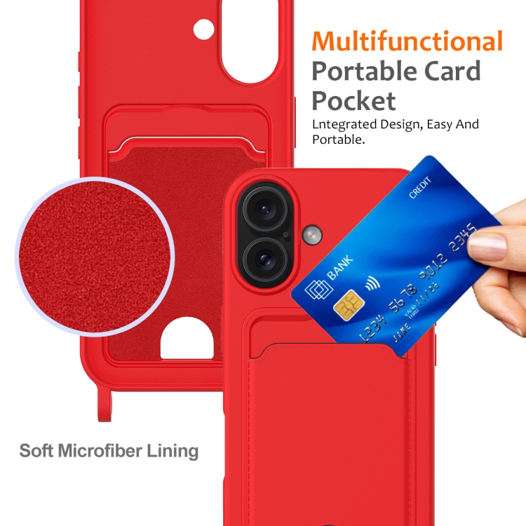 Funda para Teléfono Silicona Líquida iPhone 16 con Tarjetero y Cordón (Rojo)