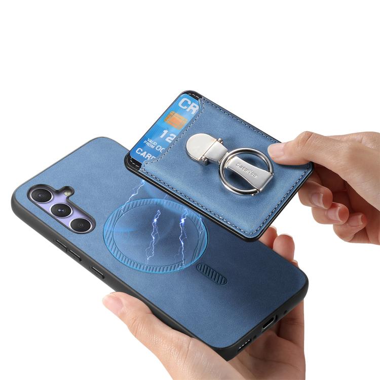 Funda retro plegable con anillo y tarjetero MagSafe para Samsung Galaxy A25 5G (azul)