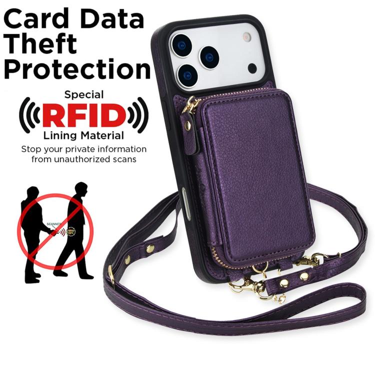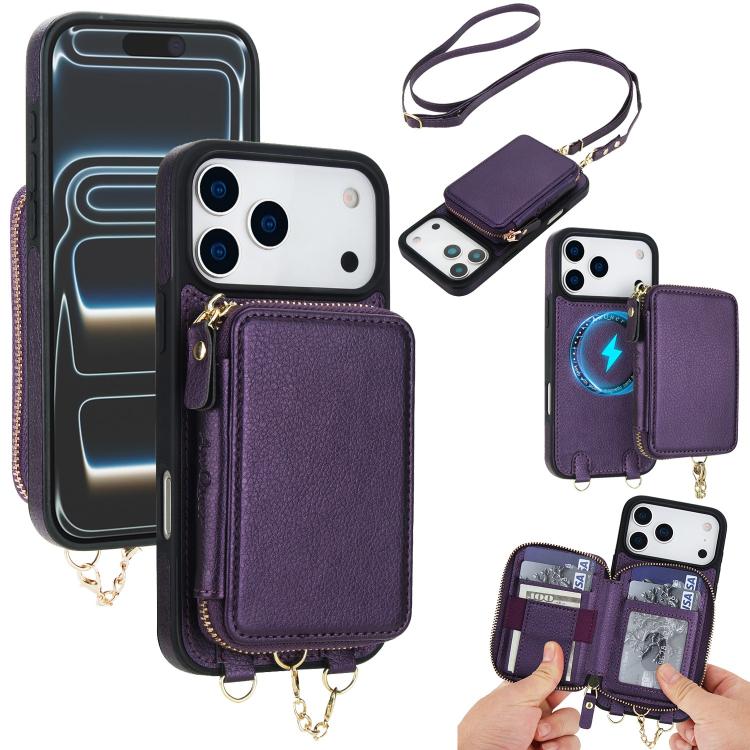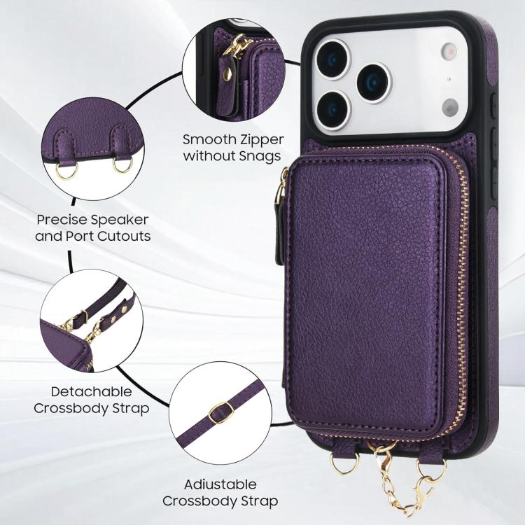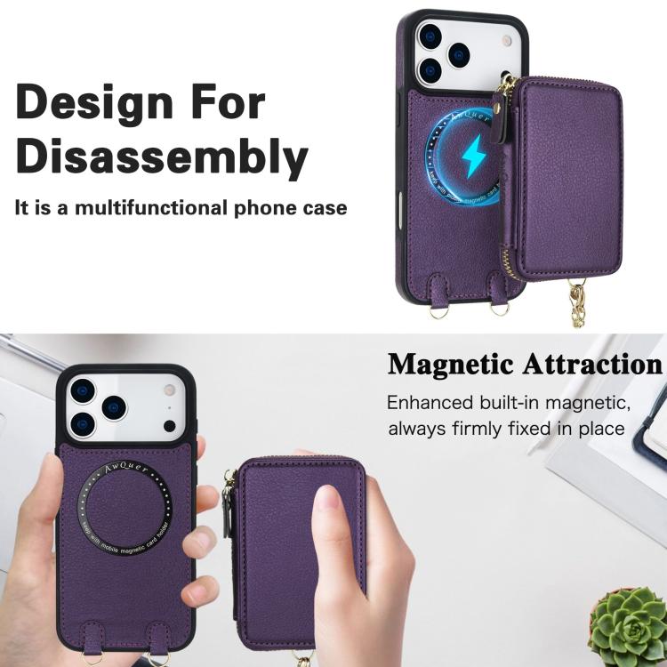 Funda tipo cartera bandolera con cremallera AwQuer 2 en 1 para iPhone 17 Pro Max con parte trasera de cuero (morado oscuro)