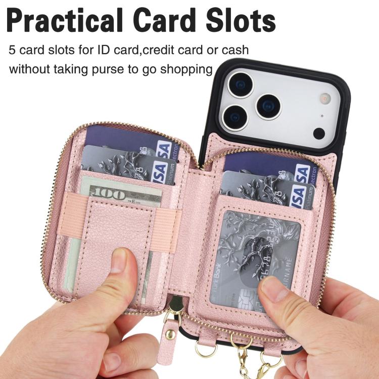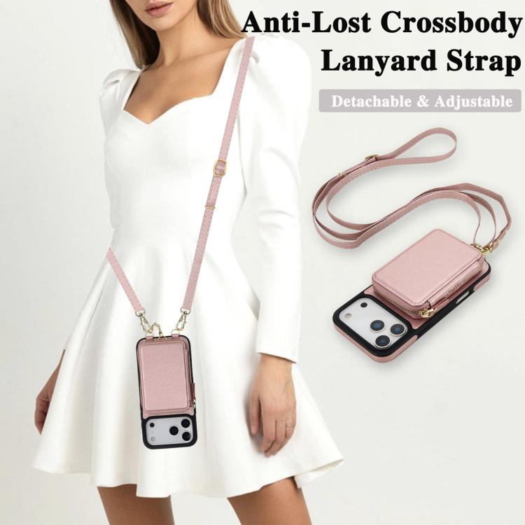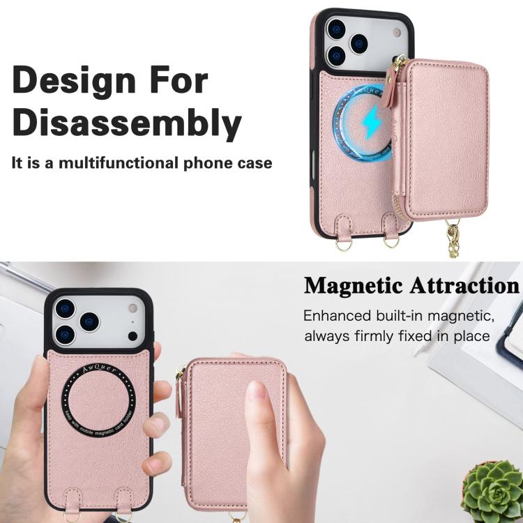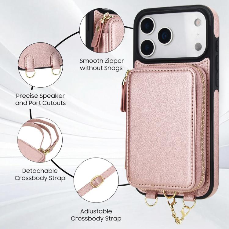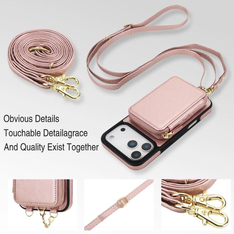 Funda tipo cartera bandolera con cremallera AwQuer 2 en 1 para iPhone 17 Pro Max con parte trasera de cuero (oro rosa)