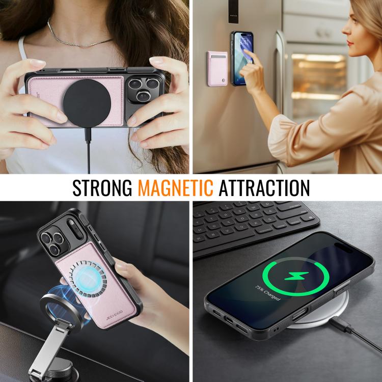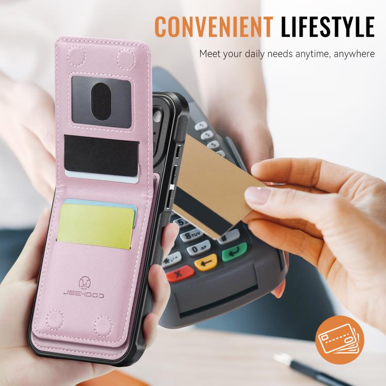 JEEHOOD J06 - Funda de PU con tarjetero RFID MagSafe estilo británico para iPhone 17 Pro (rosa)