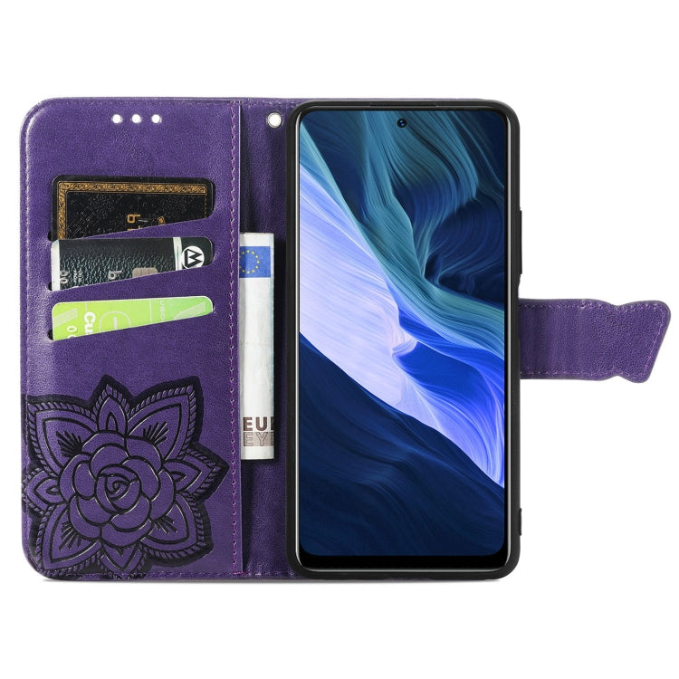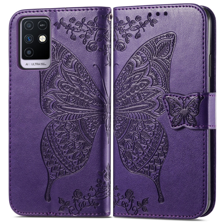 Funda Cuero Mariposa Amor Flores En Relieve con Soporte y Ranuras para Tarjetas para Infinix Nota 10 (Morado Oscuro)