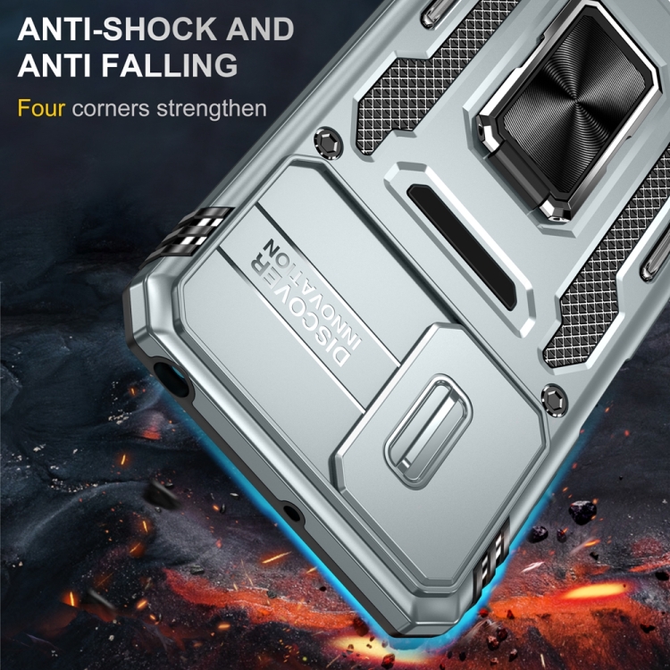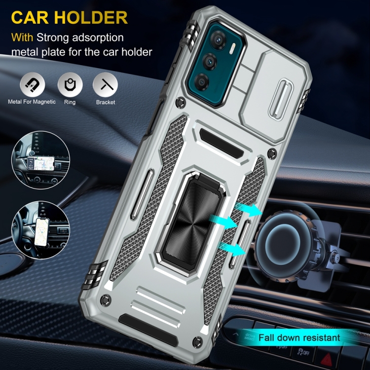 • Protección con Cubierta deslizable para Cámara, Bolsas de aire en las cuatro esquinas para absorción de impactos, Soporte magnético para autoMóvil, anillo de Metal giratorio 360 grados, acabado con microcepillado para mejor agarre