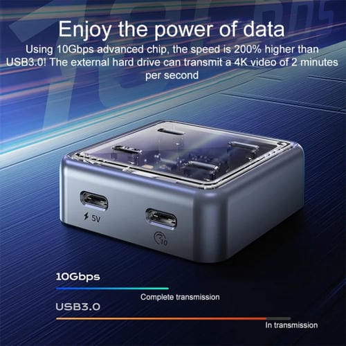 • Interfaz de entrada USB Tipo C; 4 Puertos USB-C de salida; velocidad de transferencia de hasta 10 Gbps; Cable USB-C a USB-C disponible en 0,5 m y 1 m; dimensiones 56,9 x 56,9 x 20,7 mm
