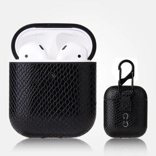 For AirPods 1 & 2 Protective Case PU Leather Snakeskin Texture Anti-Drop Case with Carabiner (Black)