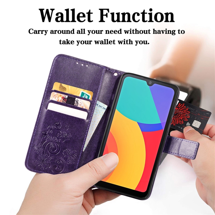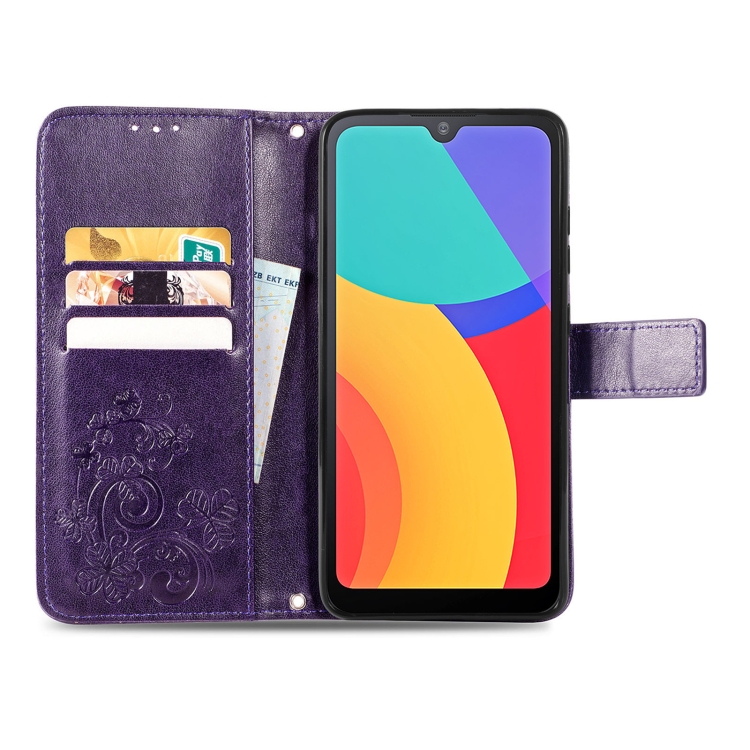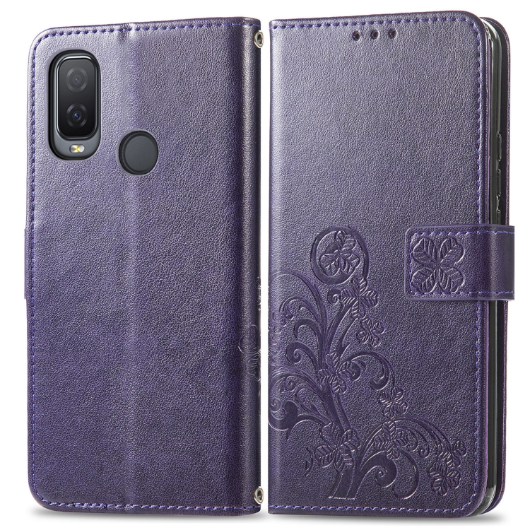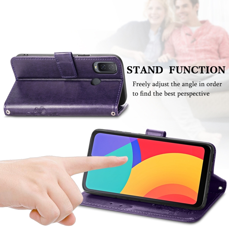 Funda de Cuero para Alcatel 1L 2021 con Cierre de Cuatro Hojas, Hebilla, Ranura para Tarjeta y Soporte (Púrpura)