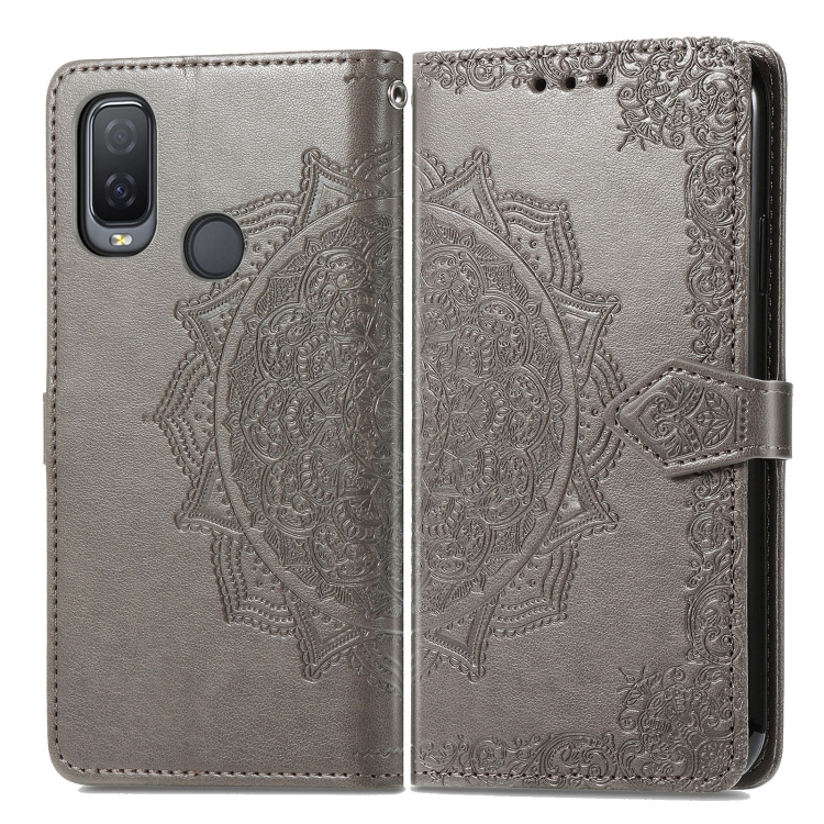 Funda de Cuero Flip Horizontal para Alcatel 1L 2021 con Soporte, Billetera, 3 Tarjetas y Cordón (Gris)