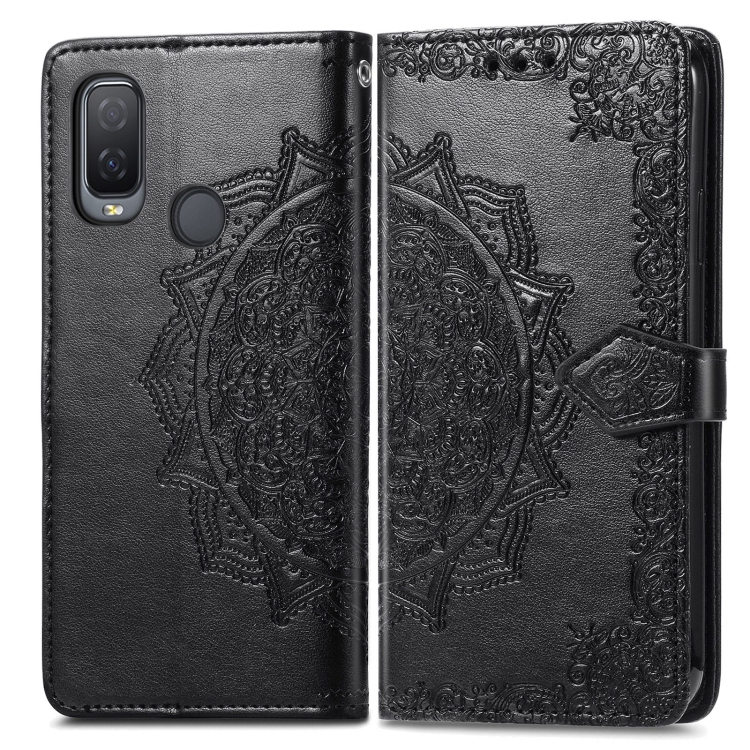 Funda Cuero Horizontal Alcatel 1L 2021 Mandala Flower con Titular, Tragamonedas, Billetera y Cordón (Negro)