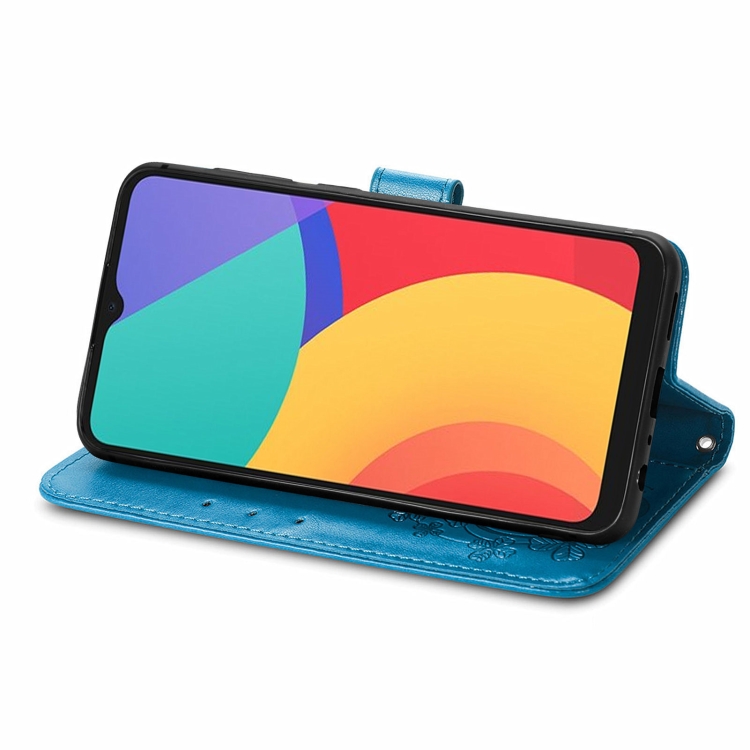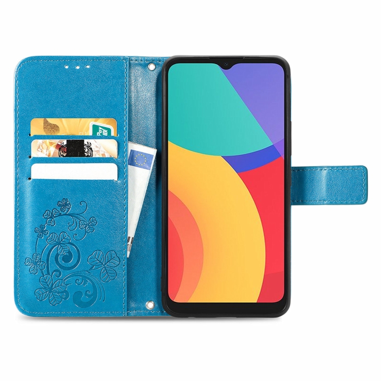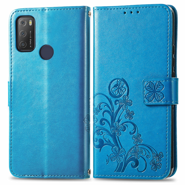 Funda de Cuero para Alcatel 1S 2021 con Cierre de Cuatro Hojas, Hebilla, Cordón, Ranura para Tarjeta y Soporte (Azul)
