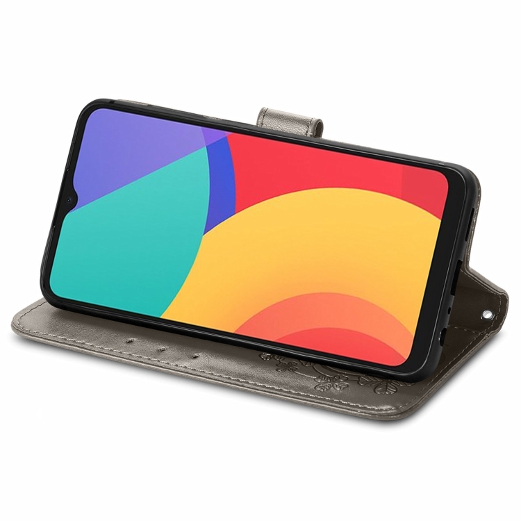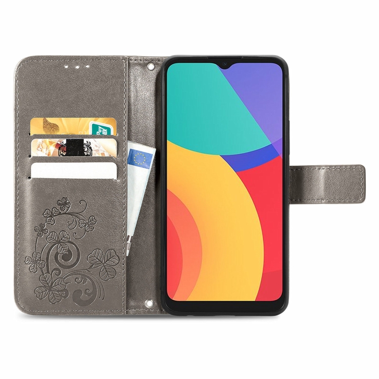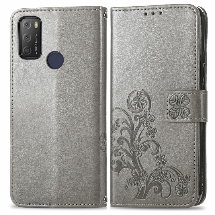 Funda de Cuero para Alcatel 1S 2021 con Cierre de Cuatro Hojas, Ranura para Tarjeta y Soporte (Gris)