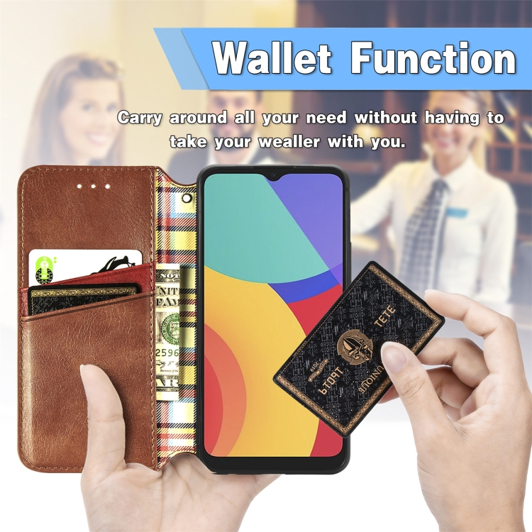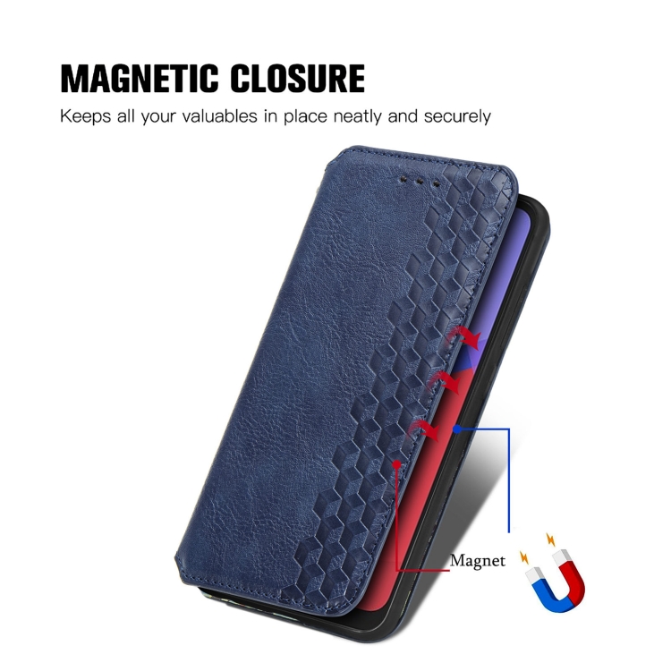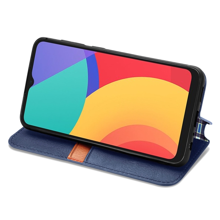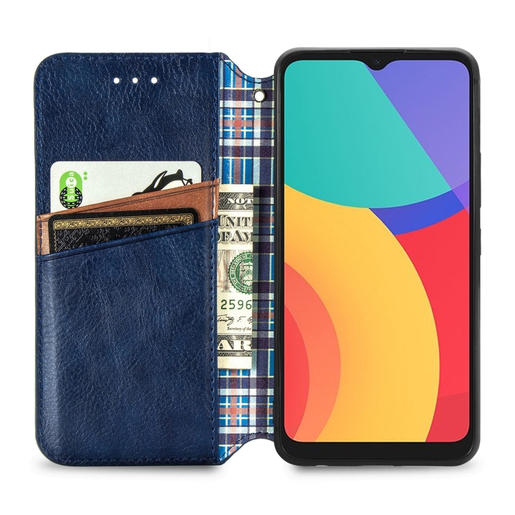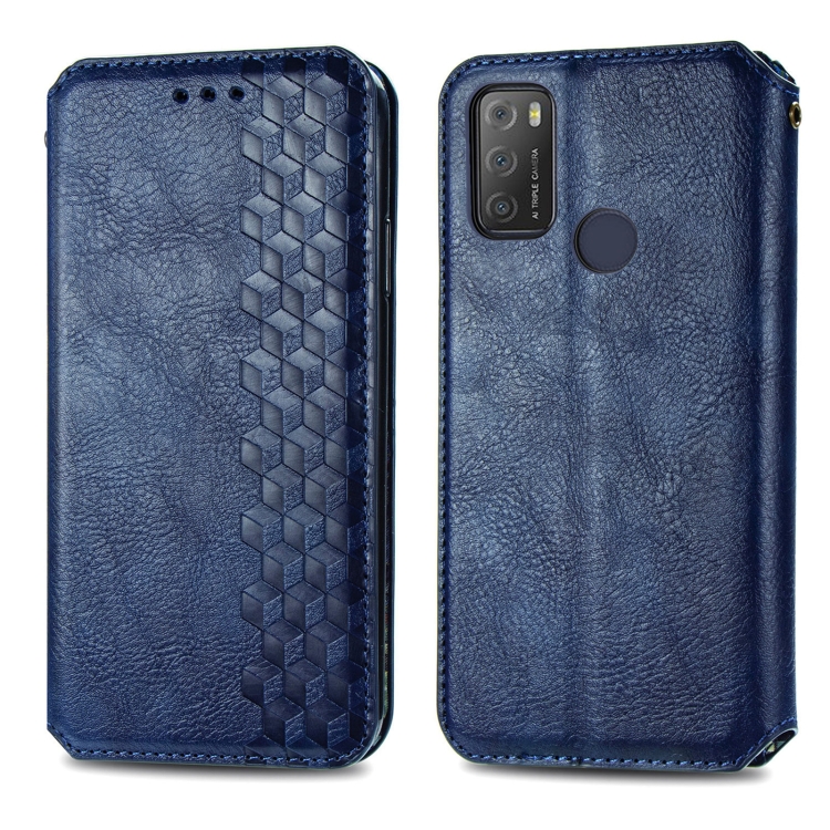 Funda de Cuero PU para Alcatel 1S 2021 con Rejilla Cúbica, Soporte, Tragamonedas y Billetera (Azul)