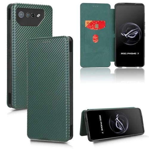 Funda de Cuero para Asus Rog Phone 7 con Tapa de Textura de Fibra de Carbono (Verde)