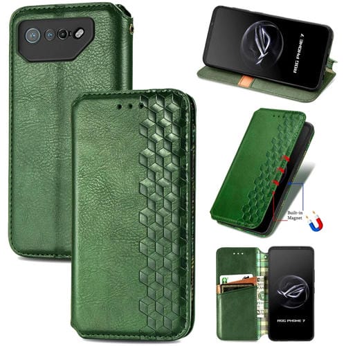 Funda para Asus Rog Phone 7 de Cuero Magnético Prensado con Rejilla Cúbica (Verde)