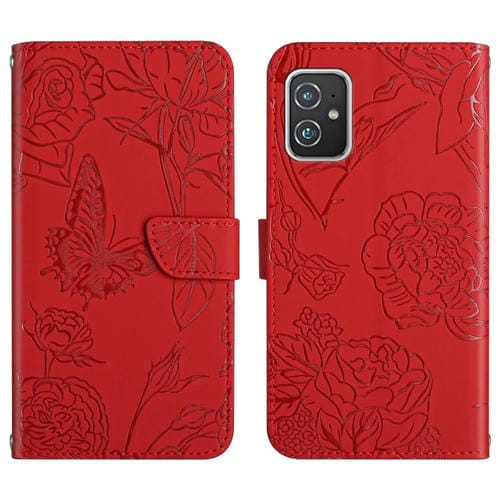 Funda de Cuero En Relieve para Asus Zenfone 8 Zs590Ks Siente la Piel de la Mariposa Peony (Rojo)