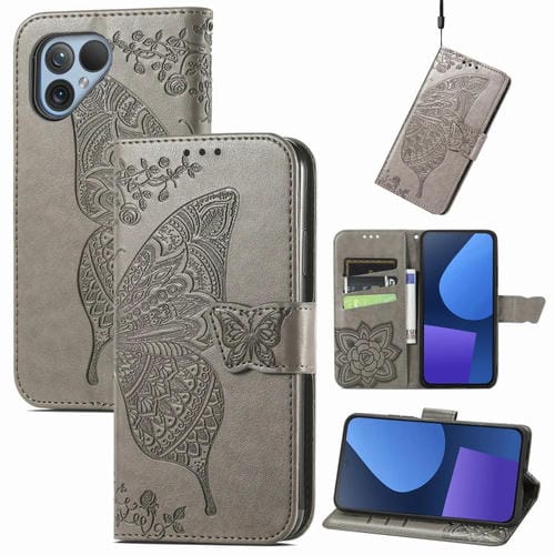 Funda para Fairphone 5 de Cuero con Relieve Flor Amor Mariposa (Gris)