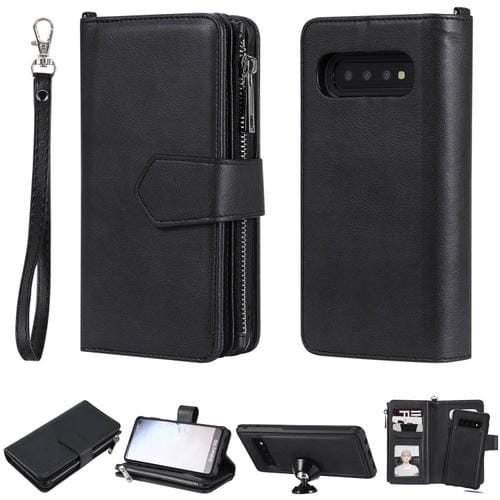 For Galaxy S10 2 in 1 Solid Color Zipper Shockproof Protective Case with Card Slots & Holder & Photo Holder & Wallet Function (Black)