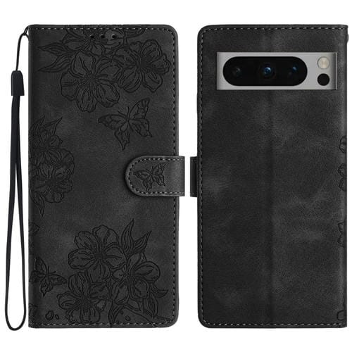Funda para Google Pixel 8 Pro Cherry Blossom Butterfly Skin Feel de PU en Relieve (Negro)