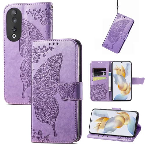 Funda para Honor 100 Pro 5G de Cuero con Relieve Flor de Amor y Mariposa (Lavanda)