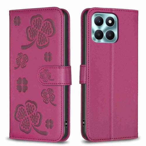 Funda para Teléfono Honor X6A Cuero con Relieve de Cuatro Hojas (Rojo Rosa)
