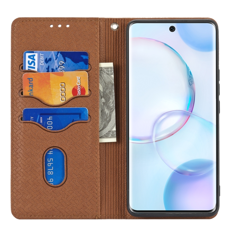 Para honrar 50 texturas tejidas costuras magnéticas Funda de cuero Horizontal Flip PU con soporte y tragamonedas y billetera y cordón (marrón)